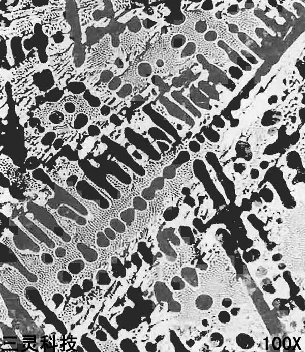 材料名称:亚共晶白口铸铁[w(C)3.55%, w (Si) 0.19%, w (Mn) 1.02%] 浸蚀剂:4%硝酸酒精溶液 处理情况:铸态 组织说明:黑色枝晶状为珠光体,基体为共晶莱氏体。 由于采用了激冷的方式,铁液首先析出了具有方向性的奥氏体枝晶,冷却至共晶温度,在奥 氏体晶间形成了莱氏体骨架,至共析相变,奧氏体枝晶转变成珠光体。 硬度:56HRC |